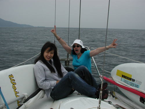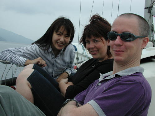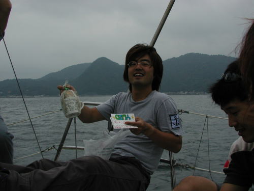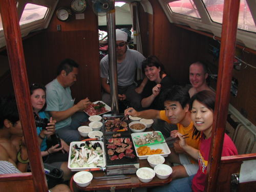 梅雨に入って天気が気になる毎日です。週の中間までは 雨の予報 晴れ男の多い我がアンタレス3世は念力によって とうとう曇りまで回復させてしまった。 今日はオーストラリアンが4人も乗船してくれました。 Andyがいなくなってから久しぶりの国際親善ボートになり楽しい一日でした。往路 「あ!レックス」のOyoyoさんが後ろから追っかけているとは露知らず 少しだけ競争意識を出してしまい鈍足のアンタレス3世がエンジン全開で逃げまくりました、こんな時に限って双眼鏡も出さず、行け行けGoGoで戸田に向けて一目散です。電話も掛けてくれたようですがエンジンの騒音とおしゃべりでまったく聞こえずで〜す。ごめーーーん でも戸田で会えて良かったです、焼肉の材料が余って困っていたら「あ!レックス」が到着してくれました。よかったーーーーとさっそく差し入れて早期処分完了です。帰途 夏特有の南の季節風?が強く吹いており観音開きで快走快走です。船長は口も聞かずに真剣に舵を取っていたら、何で口利かないのかオージーが心配してました。「ウネリとラン帆走でよそ見してる余裕がなかった」 Yozo