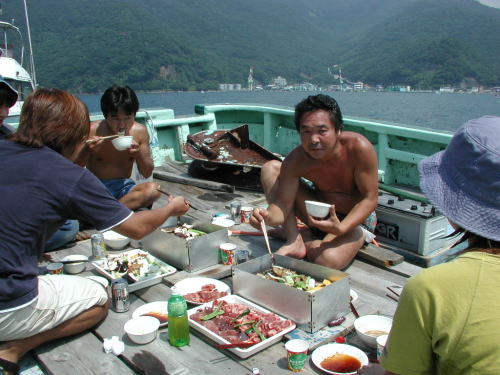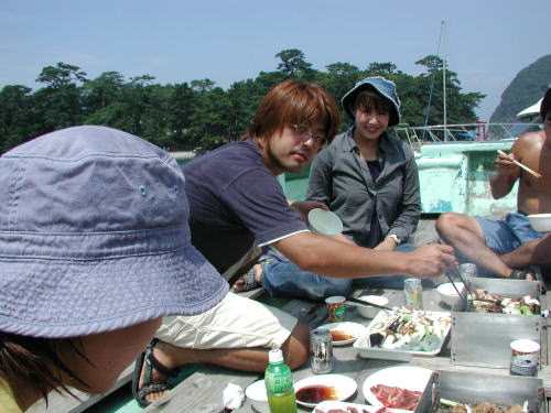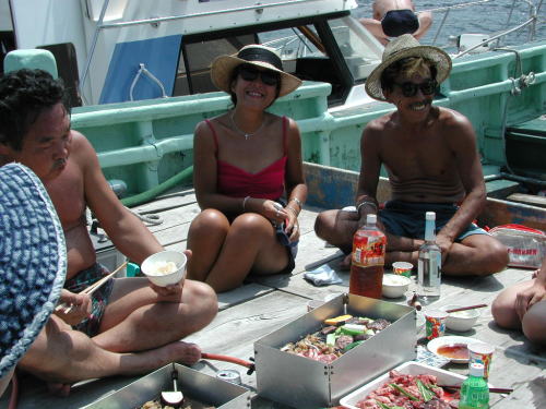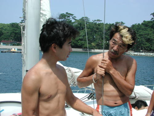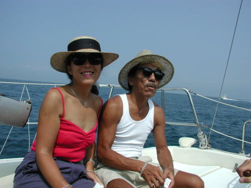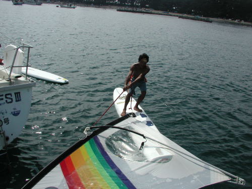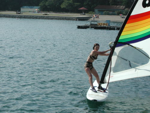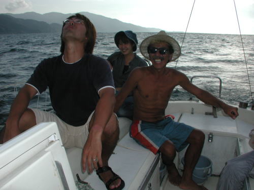 天気予報は昨日から傘マーク、でも最近の予報は当たったことなし、我が家の函南砂漠は青空が見えています、当然 快晴の予定で出航です。今日のゲストは東京からKaionさんご夫妻です。我がアンタレス3世のホームページを見てくれてから一年越しのお付き合いで本日が初のご対面で〜す。もっともアンタレスの私達は初めてですがKaionご夫妻はHPで顔見知り????お互い 期待に胸を膨らませての航海です。 ハニー・ダーリンと呼び合う二人をまのあたりにして都会の人って仲がいいんだね・・・・っと羨ましくもあり こそばゆくもあり・・・・です。午前中は風がほとんど無くいつもの通り機走にて一路戸田へ、道中の会話が楽しく関東のセーリング状況をいろいろ教えて貰いました。 戸田の「水八丸」では反対舷にモーターボートが何隻も係留したいへんな賑わいです、でもいつもの顔ぶれのため一緒になってワイワイガヤガヤの楽しい一時です。風も穏やか、水温も高く泳ぎやウィンドサーフィンにはもってこいの日和でKaionさんもウィンドに挑戦し頑張っていました。 帰途はSWからのスピンランには丁度良い風を受け淡島沖まで快走につぐ快走で満足のゆくセーリングが出来、遠来のKaionさんご夫妻にも喜んで戴けたかと思います。 Honey Darling