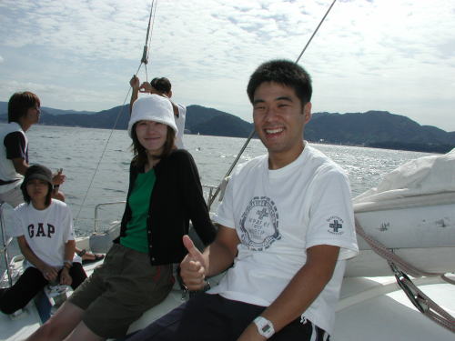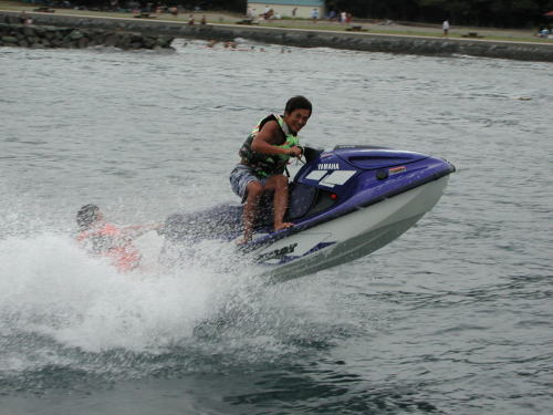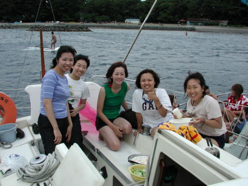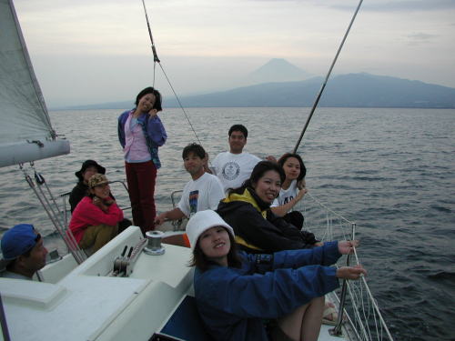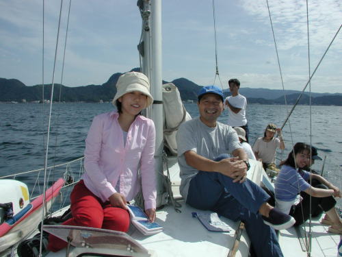 例年9月の声を聞くと、浜辺はバタっとひと影が無くなってしまいます。今日の戸田もあれほど賑やかだった海岸には海水浴を楽しんでいる人はほとんどいません。沖のブイへ舫ったヨットやパワーボートの海好きのごく限られた人々だけのプライベートな海にかわっています。海水の温度暖かく気持ちの良い水の中ですが、東の風が少し冷たく海から上がると肌寒い感じのする天気です。いつもの「水八丸」にGさん達のパワーボートと一緒に係留してお互いに行ったり来たり大勢でワイワイガヤガヤの賑やかな船になってしまいました。我がアンタレス3世の女性陣は水上バイクのベテランライダーに乗せて貰い、強烈なスピードとターンに振り回され、大騒ぎした割りにはケロット満足したような「顔」(^○^)で戻ってきます。音なしのウィンドサーフィンではとっても敵わない????・・・・・何だかいつものアンタレスの雰囲気から逸脱したけど、楽しい一日でした。