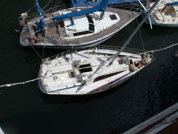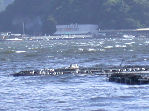 | 強風と波浪の高い日でスリリングな航海の一日でした。大型で強い台風7号の影響で波浪警報の出ている日でしたが、出航前は江之浦湾付近はそれほど白波が立っている状況ではないので近回りをするつもりでの出航です、SWからの強い風を受け2ポイントリーフにセットしたメンスルのみで軽くセーリングしたあと淡島を一周してスカンジナビア訪問です。3回連続の寄港でホテルのフロントの女性にやっと顔を覚えてもらえました。先週とはうって変わって美女2人を含めた5人の乗組員でキャビンは余裕の広さです。夏にはチョット暑かったですがすき焼きを囲んで昼食をゆっくり楽しみ、午後はスカンジナビアの船内探訪です、時間と共に風波が強くなりだしたので早々に遊びを切り上げ帰港しましたが、いつもは穏やかな江之浦湾内にも白波が押し寄せるほどうねりが強く係留ブイを拾うのは真剣勝負でした、手順を予めしっかり打ち合わせしての着岸です。着岸後もテンダーで一人ずつ慎重に岸へ移動しエキサイティングでスリリングな上陸です、全員無事上陸できホッと緊張が解けました・・・・・よかったーー落とさなくて。( 右下の写真は係留場所から沖を写したものです、江之浦湾の奥までこんなに荒れることは珍しい) |