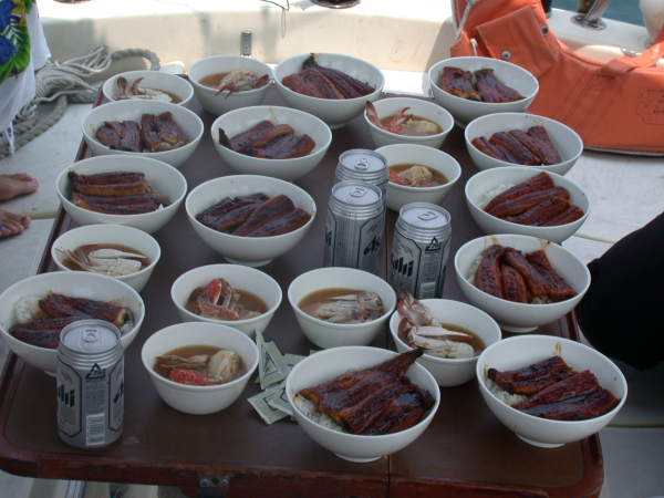| 出航日時 2002.07.28 JST 09:00 〜 18:07 寄港地 戸 田 気 象 快 晴 風 AM 0〜0m/sec PM 南東 04〜05m/sec Captain M.Ochiai Crew Yuzo.O Shinji.C Hideyuki.T Towako.O Tomoko.A Yoshiko.N Tomoe.A Konomi.S Minako.N Sala.Y Maya.Y Menu うな丼 かに汁 フルーツ&ヨーグルト |