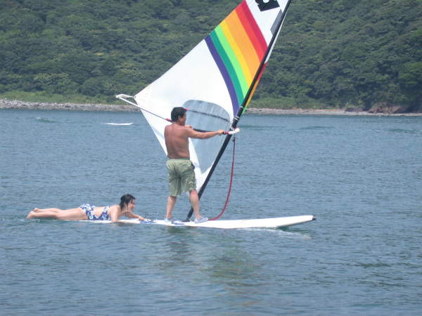 | 天気晴朗 風なし波なし真夏日和でーす、快調に戸田に向けて機帆走(日陰作りのため)してます、今日は今年一番の華やかなムードのアンタレス3世です(^o^)丿、なんと女性8人 男4人のハーレム状態で船長はさっそく鼻下長に成り下がりました、戸田は相変わらず監視船がうるさく沖へ行け・・・って来ますがすべて無視して「水八丸」に横抱きさせ居座ってます、でも他のボートはしばらくすると嫌になって沖のブイに逃げます。Tattooをしたお兄さんと美女を乗せた大型のパワーボートが直ぐ近くに係船したので、興味津々おっかなびっくりでウィンドやカヌーで近づいたり覗き見したりでちょっと緊張ぎみです。ウィンドサーフィンには丁度良い風も吹き、夏本番を楽しめました、帰途 大瀬を越えてから良い風が吹き出し、Tomokoちゃんの舵取りで楽しいセーリングを楽しめ初めてのゲストにも良い思い出とTomokoちゃんの本格クルー化教育ができ何よりの一日でした・・・・・。 |