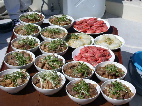 | 出航日時 2002.10.13 JST 09:00 〜 17:15 寄港地 戸 田 気 象 快 晴 風 AM 南東 8〜10m/sec PM 南東 4〜6m/sec Captain M.Ochiai Crew Yuzo.O Tadamitu.T Shinji.C Jun.Y Akihide.I Takashi.N Tomoko.A Erika.T Miyuki.N Yukai.Y Matumi.N Yoshiko.I Syouko.Y Menu 肉丼 ボイルエビ ヨーグルト&フルーツ |