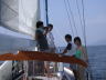 | 1泊2日の素晴らしく楽しい航海でした、うねりがまだ少し残っていましたが台風一過(11号)の快晴です。目的地の田子港を目指して一路南下・・・宇久須沖を2時間半で通過もう目前に久しぶりの田子島です、弁天島を左に見て田子港に丁度3時間で入港できました。前職でお世話になっていた漁協直営スーパーの担当者と一緒に漁協に係留申請を済ませとりあえず昼食・・・午後から向えの尊之島にアンカーリングして海水浴です、この島影は風が入らず、浅い砂地のため遊びのための錨泊地としては最高でした。夜の田子港は常夜灯が明るく一晩中釣り人が竿を出していましたが昼間からを含め釣れた魚を目撃できません、でも熱心に投げてます・・・夜風が気持ちよく入るコックピットにランタンを吊り下げ夜更けまで食事と会話を楽しみ持参したビールや焼酎はあっという間に在庫切れです。 寝不足の朝を迎え塩鮭とおかゆでお腹を満たした後もう一度寝直したあと黄金崎の海岸に移動しました。ここも波静かな錨泊地で海水浴客のいる砂浜に上陸したり、魚介類の探索やウィンドサーフィンを楽しみのんびり癒しのひと時を過ごすことが出来ました。出航前に急遽設備したコックピットサイドのシャワーは身体を洗ったり、食器洗い、潜水用具やボードの潮落としに活躍し、今回都合で参加出来なかったCくん製作のエキストラテーブルはコックピットのラダー後ろにぴったりフィットして外での食事が可能になりたいへん便利をしました。いつもと違う風景の中で非日常の生活をたっぷり楽しんだ2日間、クルー全員の協力で怪我も事故も無く帰港でき有難うございました。 |