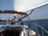 | 今日も良過ぎるお天気と風 機走した様な航跡をつけて江の浦からそのまんま井田まで帆走した、しかも常に7knotOverの快速で・・・本日のゲストは船長が通うボウリング場の美人受付嬢を2人も丁重にお誘い(ナンパと違うよ)した。終日高気圧にすっぽり覆われ真夏の太陽を思わせる暑さ、6,7mの東南東の風を受け出航早々からセールオン、穏やかな海面を滑るように真っ直ぐ大瀬に・・・大瀬入港am10時では早過ぎるのでそのまんま通過して井田に進路を向けた、井田の入口でようやく風が落ちる滅多に無い最高の帆走日和だ。穴子とエビの天婦羅を揚げ天丼として舌鼓をうち昼食後はいつもと同じ散歩組と昼寝組、寝返りも出来ないほど熱く焼けたデッキでは落着いて寝てられなかった。風が落ちた帰路は機走で一目散に母港へ・・・楽しい一日は短い!!本日の航跡 往路距離15.6km 帆走Max速度13.9km/h(7.5knot) 所要時間1時間28分 帰路距離14.5km 機走速度約13km/h(7knot) 所要時間1時間15分。 |