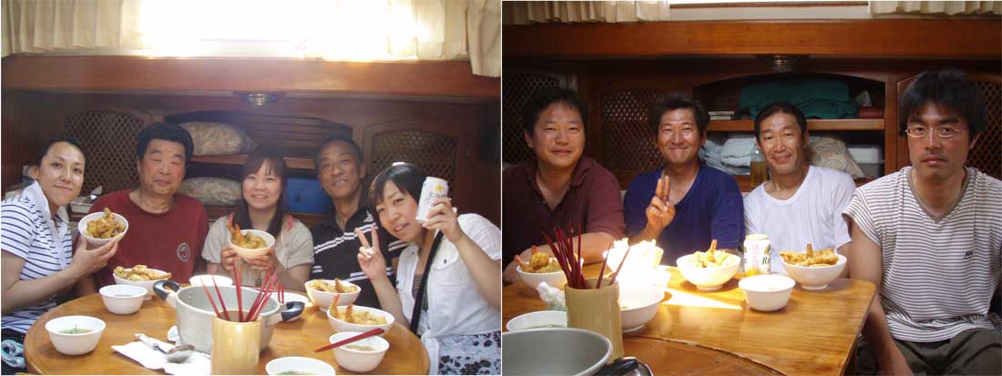 | 出航日時 2010.05.22 JST 09:06 〜 17:12 寄港地 井田 気 象 AM 快晴 PM 快晴 風 AM SEE 6-7m/sec PM SW 3-4 m/sec Captain Mamoru.O Family Yuzo.O Crew Jun.Y Kaname.S Isamu.M Makoto.I Satoko.T Tomoko.K Miho.G 合計 9 名 Menu 天丼 味噌汁 フルーツ&ヨーグルト |