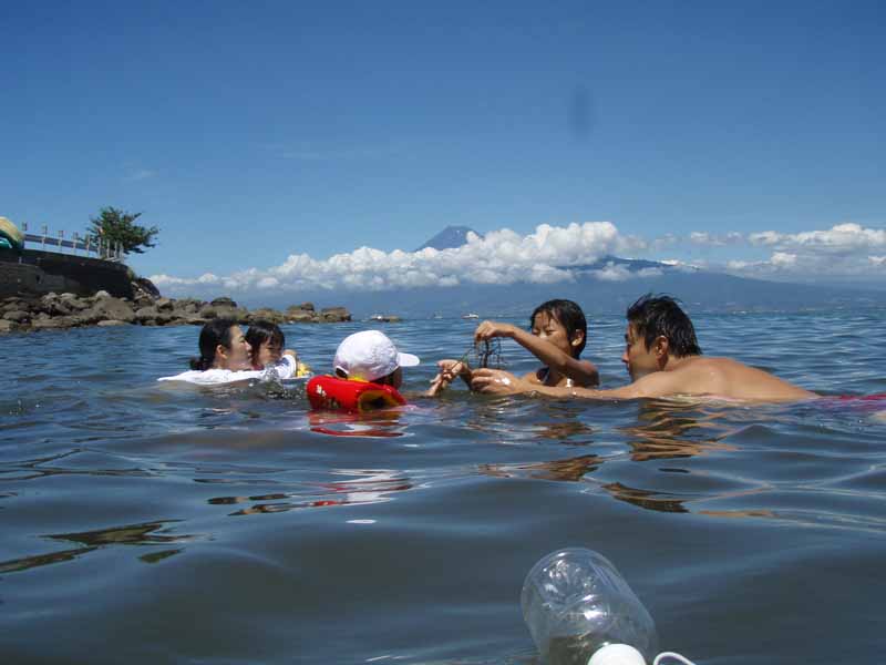 孫達と海水浴に行って来ました、足保港西側の小さな入江です。白い雲の上に富士山が一日中顔をだして日本一風光明媚なところです、今日の交通手段は子供達Familyの車に便乗させて貰い脇役のカメラマンでした、水温も高く気持が良過ぎて水から上がる事を忘れて泳いでます、奇遇ですねこんな小さな入江で一昨日アンタレス3世で一緒に遊んだT君Familyとバッタリ会い驚きました、他県Noの車がたくさん来ており遠くからたいへんだな・・・って感想ですが我々の2台も名古屋と品川Noでした(^o^)/ |
