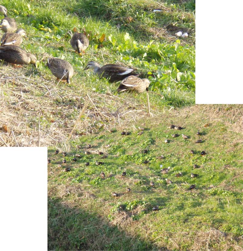草木灰 は家庭菜園にとって貴重で凄く良い肥料、化学物質が入らない本物は山の生活者でなければ入手困難です、近くの神社境内の年始明け掃除の焚き火の灰を20リットル缶に戴いて置いた。ポカポカ陽気で風が無いので畑でフルイに掛けた、1年分以上の素晴らしいカリ肥料が取れてご機嫌(^o^)/ でも風がないぶん舞上る灰で全身灰神楽になってしまった。暖かいと顔にまとわり付く小さな虫も灰が舞上っている時には寄付かず作業終了と同時に気持悪いほど一斉に寄付いてくる、もう直ぐ春だ・・・・今朝は36羽しかいなかった散歩道の鴨の群れ |