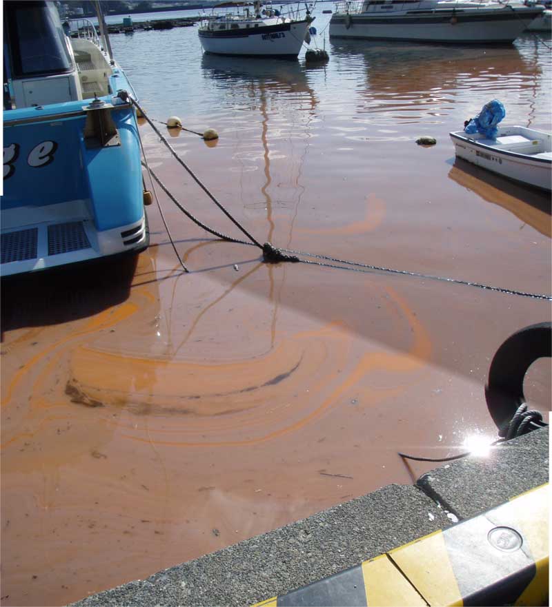 赤潮 天気が良さそうなので江之浦に出掛けた、凄い!!真っ赤な潮が岸壁付近に漂っている魚の腐った様な臭いも・・・前部ハッチからの雨漏り対策に来てみた、ヨットハウスのメカニックの調査ではパッキンの劣化が原因で代替品を目下探しているとの事、HCで購入した生ゴムのチューブを割いてパッキンの補助にしてみた、密閉性は増した様に思うが海水が余りにも汚れていて汲み上げてテストをする事が出来ない。 |
