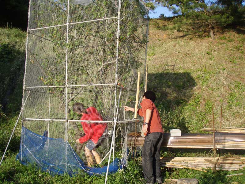 試し採り(05/08) サクランボが少し赤くなってきた、防鳥ネットを一部開放して採ってみた、色艶は良いね旨そ・・・今週末が採り頃か、例年より1週間遅く孫達には残念ながら間に合わなかった。トマト用ビニール屋根がやっと完成した、昨年失敗した部分を一年間考えて改良した、万全を期した積りだけどまだ々々不満が残る、今年の結果をみてまた改良するでもこれなら風速15m前後なら耐えられる、但し台風並風雨の耐久力は疑問??? |