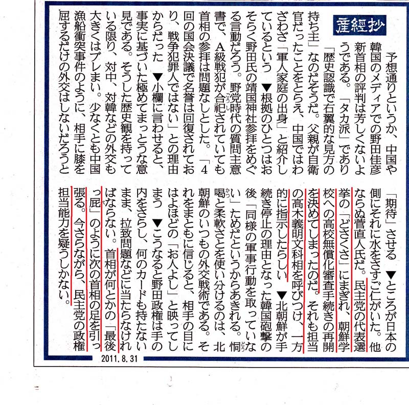 民主党の新代表に野田佳彦現財務相が決まった、2年前政権交代した時の鳩は(お人好し総理で「友愛を」)なんてホザイテルので強力なブレーンを付けて舵取りをして欲しいと「このつぶやきNo29 2009.09.01」に書いた。今度は体重的にも鳩や菅より軽くはなさそうだけど、超円高が進行中も「見守ってる」の連発で意思決定の弱さか腰の重さが目立った。個人的に暴露される様な変なスキャンダルを出さないで、しっかりとした日本丸の舵取りをして欲しいね。暑かった今日はシャワー2回、入浴2回もしてしまった、でもお陰で畑の作業が一段と進んだ・・・・ |