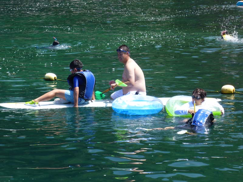 天のオーニングが効果的 お盆休みのスタートで高速道路の渋滞情報が流れている、海水浴船としての出航2回目、今日は我がFamily中心のクルーズとなった、横浜からMasuFamilyが到着して孫娘を乗せて一路井田へ・・・雨が降るかもの予報だったけど終日曇り空、お蔭様で自然のオーニングが上手に張られ真夏の直射日光を遮ってくれた。海も暖かくキレイでで熱帯魚らしきブルーフィッシュがたくさん泳いていた。クルーのみなさん有難うございました。お蔭様で孫たちによい夏休みの一コマを体験させられました、。午睡の最中重須マリーナから入電、8月20日にドック入りして9月9日には出航出来る様に修理を開始するとの事、やっと先が見えてきました、まだ夏の余韻は充分残ってますので乗船予定を立てててください。 |