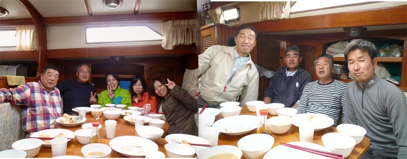 お蔭様で今シーズンも楽しいクルーズを無事に終える事が出来ました。ラストの今日は移動低気圧が近付き曇天、昼頃から雨の予報が出ており、雨の来ないうちに楽しんで来ようと出航した、東南東からの微風を感じ直ぐにセールアップ、弱い風の割合には5knot前後の帆走が楽しめた、いつもの大瀬の浮桟橋に舫いを取り僚船第六翔航夕丸のK氏を待ちながら早めのお昼準備に・・・本日のメニューは天婦羅定食(^o^)/ 海老・イカ・野菜類を揚げながらの昼食、お陽様や富士山の見えない時はひたすら食べる事に・・・・天気の崩れないうちにと午後の休憩もそこそこに片付けを済ませて江之浦に一目散、お蔭で帰途ホンノ僅かな雨に降られただけ・・・で楽しい一日を過ごす事が出来ました。今年は最盛期3ヶ月も修理のお休みが有りましたが、期間中乗船した戴けたクルー・ゲストのみなさん有難うございました、これから寒い冬の間は暫く冬眠します、来春には皆さんをお迎えしてマリンライフをたくさん楽しみたいと思います。またお友達をたくさん誘ってお出掛けください、首を長くしてお待ちしております。 |