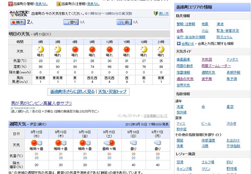 佐渡はずっと雨予報 今度の日曜日出発1泊2日のバス旅行で家内と佐渡へ行く予定、週明けから天気予報を眺めているけど芳しくない・・・・気温も函南より4~5度位低い事があり服装に迷ってる。子供達から夏前に旅行費用をプレゼントして貰ったので今年はまだ行ったことがない佐渡へと決めた。TVの天気予報 明日は日本海側では大雨、太平洋側では晴天が続く様。こちらが晴れの時は向こうは雨が多い、けど今度の日・月曜日は両方とも雨(ー_ー)!! |