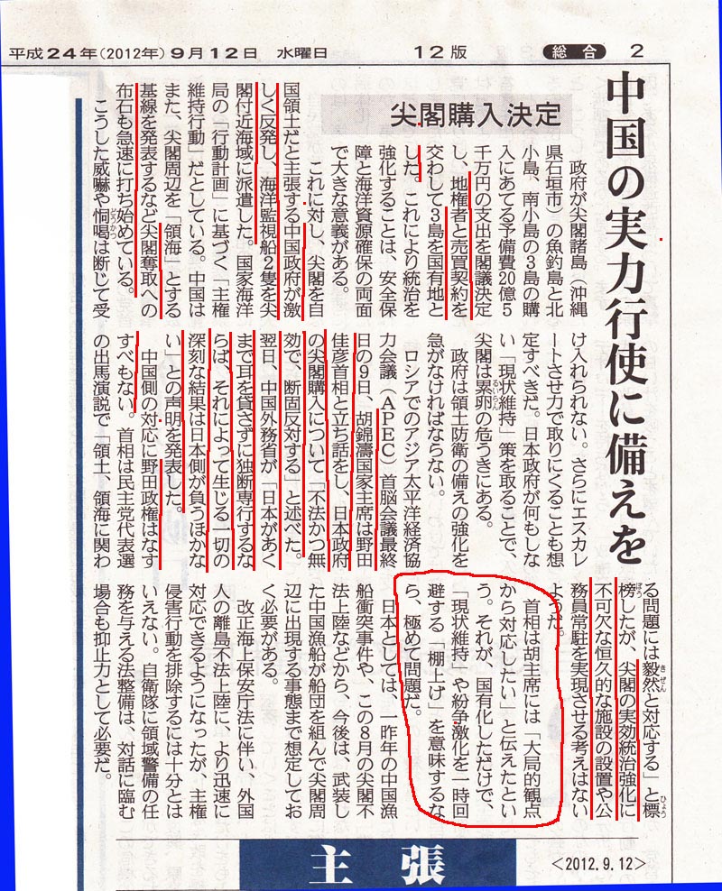 尖閣諸島にいよいよ支那が具体的な行動を起こしてきた。数か月前石原東京都知事が購入表明した時、1年後の契約完了までに支那が黙って見てないと考えてた、弱腰外交の日本政治に付け込む事は明らかで、自衛隊が海保や警察と連携を取れない事を見透かしている。この問題は日本国民が領土を守ると云う強い意識を明確にして法律(憲法も)の整備を緊急にしないと竹島や北方四島と同じになる恐れがあると朕は思う。支那は石原憎しで2020年のオリンピック開催地決定の事も陰湿な邪魔をしてくるだろう・・・ホームページが新しいサーバーに切り変わった様だ、トップページのcounterが切れていたので新しいのをフリーソフトからダウンロードして取付けた。「乗船申し込み」は暫く時間が掛りそう・・・ |
