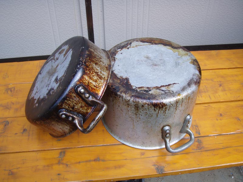 厭きちゃった(ー_ー)!! 船から下した鍋2ヶを先日から磨いてる、長い間天ぷら等の揚げ物に使っていたので油焦げが凄く厚くなってる、いろいろな道具を引張りだしてるがチットモ光ってこない、取り敢えずだけどbefore now(気が向いたらもっと磨き上げるが・・) 3日に下した滑車やスノコ、テーブルなどの磨きとニス塗りが沢山ある、来春までにと時間はたっぷりあるけど、早くやらないと周辺が片付かなく邪魔でしょうがない・・・・ |