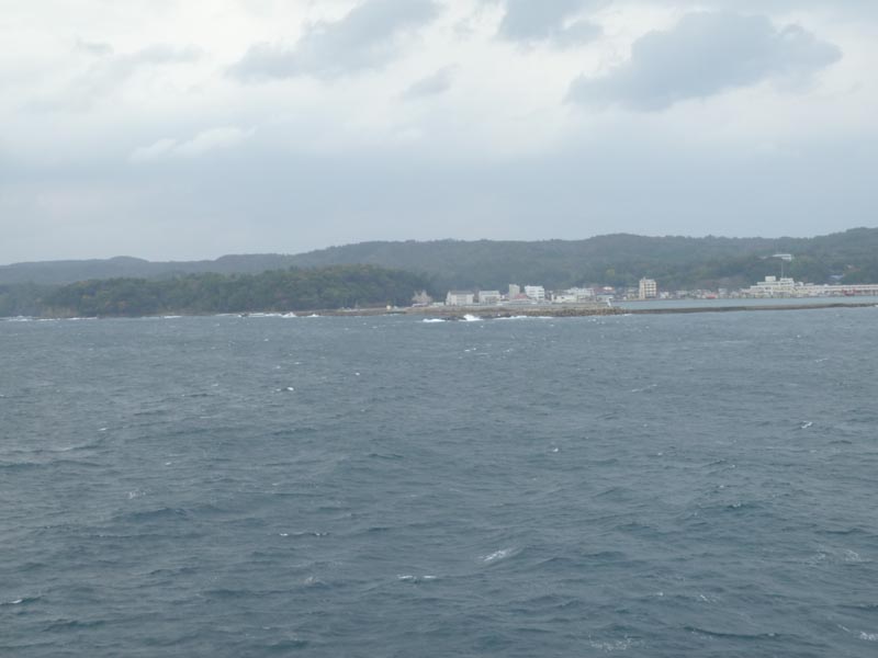 佐渡の旅(その6) 金山から小木港までの車窓・・・山側に座っていたので海の写真が上手く撮れない。でも伊豆国立公園の近くに住む者にとって荒波が作る奇岩や荒々しい海岸線は感動が薄い、それより打ち寄せる波の大きさや沖の白波をみると帰路のフェリーの揺れ具合がどんなか・・・・事前チェックの波高4m 風15m超の予報が当たっている様だ。 小木港に11時到着、12:50の出航までにみなさんお土産物を買い込み、いざ乗船・・・でも乗客は100人も居ないガラガラ・・・・往路と同じく1等船室に入つた、港の付近では白波はみえないが岩場岸には大きな白いしぶきがあがっている。修羅場が待つ???? |