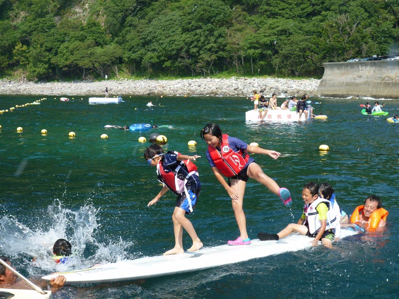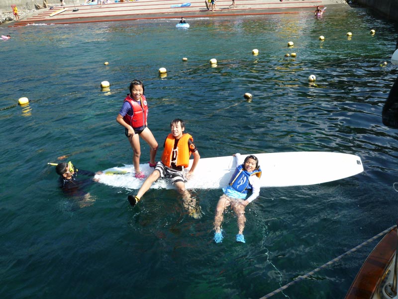 FamilyDayが穏やかな海でよかった!!総員18人名 4家族の子供6人 を乗せていざ出航、陸では猛暑日のなか気持ちの良い潮風に吹かれて一目散に井田の海水浴場を目指した。奥駿河湾は今日も波も風もない静かな海・・・・いつも出会う田子の浦港からのパワーボートが係留場所を開けてくれてたのでスムースに着岸、遮光ネットで日除けをセットのあと直ぐに海に・・・・熱した身体を透明度のよい海水が気持ち良く冷やしてくれる。昼食後も子供達はWSFのボードに乗ってバランスごっこ・・・大騒ぎで海を満喫した。帰航時には西寄りの微風も止まってしまい帆走は出来なかったが「夏休み本番!家族で海へ」の楽しい一日だった。 |