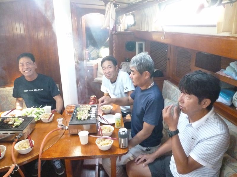 秋!だね、こんな爽やかなお天気なのに総員たったの8名(夏が終わった)・・・夏富士も姿を見せ内浦湾は絶好のマリン日和で釣り船がイッパイみえる、帆走には物足りない風なので機走にて一路井田に向かう、途中江梨の岸壁の様子を初めて探ってみた、広くて良さそうだけど引き波が直に入りそうで居心地は悪そう・・・覗いただけでタッチもしないでそのまま井田へGo・・・井田の海岸はダイバーも少なく透明度もよく風も爽やか、みんなで刺した串焼きと栗の炊き込みご飯で舌鼓・・・・午睡の休養組やダイバーの訪問を受けたり軟派したり午後のひと時を過ごす。帰途先程まで吹いてた風が落ち大瀬岬を回ってから帆走開始、東からの心地よい風と鮮やかな夕日を見ながらの楽しいクルーズだった。 |
