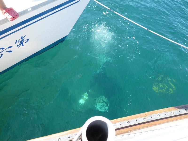 船首俵の交換作業 お蔭様で想定通りに上手に交換が出来た。8年前(多分)に設置した発泡スチロールの俵が経年変化で外皮が破れ もやいロープが俵に食込み始めた、強い波風に煽られて外れると事故につながるので早めにとクルーの応援を頼んでの作業・・・・陸側から3本のロープが引いてある。これを順次船首側で持上げ仮固定して旧の俵を解除しての作業だが、長い間にフジツボだのサンゴがビッシリ付着して凄く重い、船上とテンダーとの連携を取りながら3時間の作業で無事完了した。これで7~8年は大丈夫、みんなご苦労様でした有難う!! |