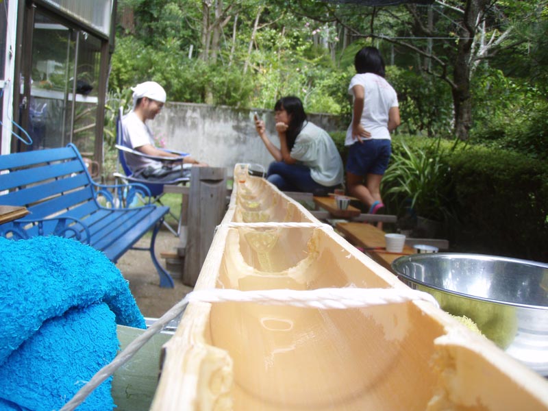 流しソーメン完売 娘婿さんに手伝って貰って西側斜面の竹林でおよそ15mのぶっ太い孟宗竹を切り倒した、切倒し直後は水を含んでるので長さ7.5mに短くしても非常に重く庭までやっと引き摺り込んだが2人とも汗だく・・・得意の寒冷紗を張って猛暑日の直射日光を50%カットしながらの恒例作業も慣れてはいるが暑くて々々、お昼前には準備が整い・・・"いただきま~す"ソーメンもミニトマトも流して・・・美味しかった。歩くのが達者になったSyoumaは従兄妹達に囲まれてご満悦、仲間入りの儀式も完了した様子。 |