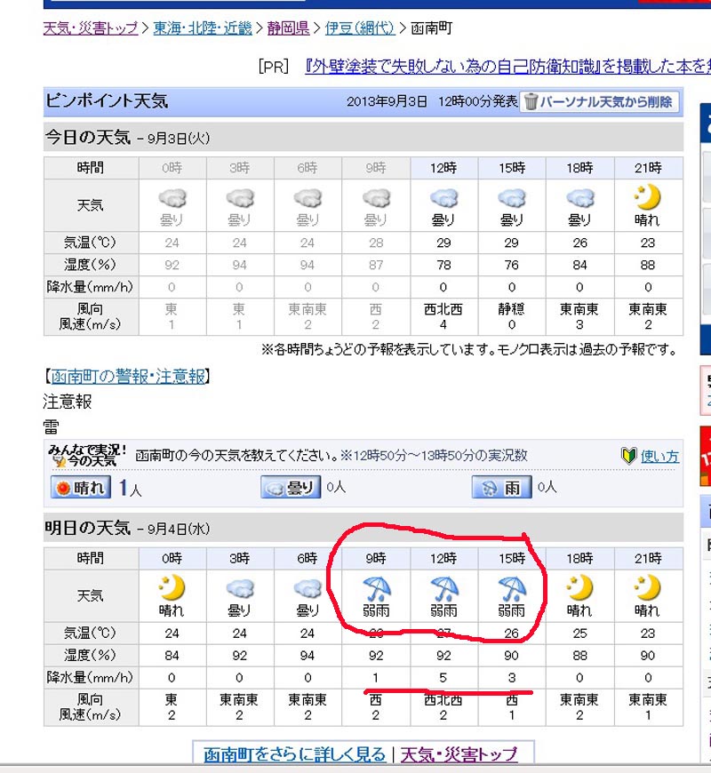 忘れられた町函南 数年前の市町村大合併前、田方郡は9町村あった、平成の大合併で伊豆市・伊豆の国市に分離、戸田村は沼津市に・・・残ったのはわが町函南だけで田方郡は1町だけの存在になった。それ故か天気予報ではよく名前が抜ける。昨夜から今朝に掛け台風18号の影響による大雨が凄く洪水警報が近隣の都市に発令されている、隣の三島や伊豆の国市にも・・・でもニュースには我が町の名前は出ない、両隣に出ていてもだ・・・普段の予報もよく抜け忘れられた町としてヒガンでる。でも今日の天気 部落の運動会は中止になったが、ヨットは昨日で良かった!出だし雨で困ったが今日の出航だったらと思うと(^o^)/ 在ハワイの国防総省発信の台風情報 沼津に直撃のラインが引かれてる(19:40) |