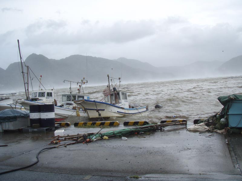 急変 江之浦の海が30分くらいで・・・11時45分EarthSapphireのA氏から隣の船とぶつかり合ってるとの連絡が入った、エッさっきSea DogのI氏から9時30分の写メが届き、いつもと変わらない様子ですっかり安心してた。押っ取り刀で江之浦に飛んでった、放水路河口の海は凄まじい形相、江之浦の岸壁には漁師が大勢出て海と自船を 見ており人が飛ばされる位強い風が吹き荒れてる 地元漁師曰く30分くらい前に急変したとの事、30余年江之浦に船を預けてるがこんな荒れた海は初めて・・・我がANTARES3世は隣のアルカディアと大揺れに揺れながらスリスリ、18号通過後の吹き戻しか???被害状況はまだ不明・・・ |