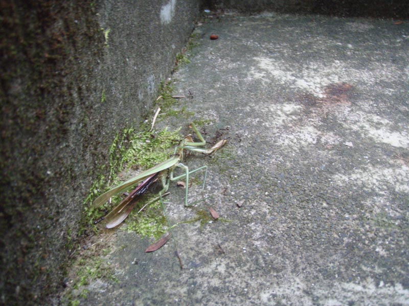 蟻パワーと集団行動 コンクリートの階段にカマキリの死骸を運んでいる蟻の群れを見つけた、階段の垂直と水平部分の正味一段を上がるのに約2分と凄いスピードでカマキリを運んでる。誰がリーダーか判らないけど壁からずり落ちそうになるのをバランスを取りながら上手に引っ張り上げる、2段目垂直部分の途中に巣穴があるのか止まってしまった。午後もう一度みたら美味しい胴体の所は運び込まれ羽と足だけに・・・お見事!! |