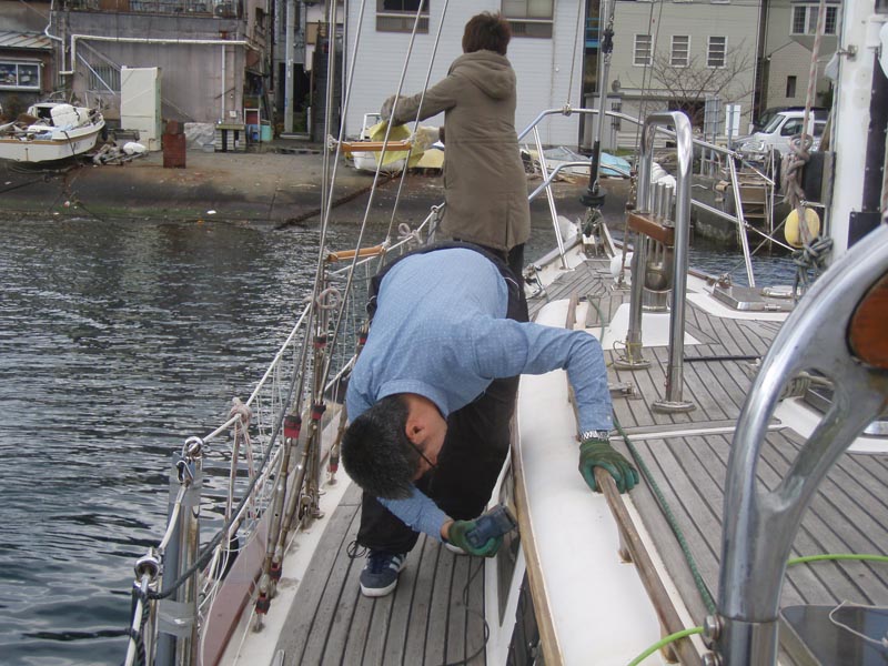 お陰様で事前準備がほゞ完了した、美女2人の応援を得てキャビン内の清掃との壁・床へのワックス掛けが終了しました。デッキのニス塗も3回目を本日済ませた。あとデッキの砂ぼこりを水洗いして上架前作業が終わりです。西高東低の高気圧に覆われ冷たい西風がチョットあったが良い天気に恵まれました。SさんTさん有難うございました。シーズンインしたら皆勤で乗船してくださ~い。 |