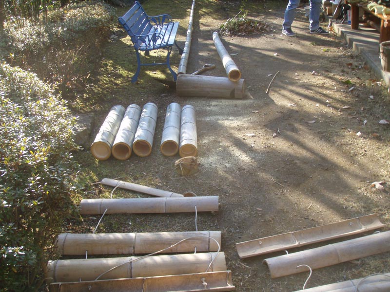 5年持てばいいよね・・・テンダー用のスライダーを新しくした昨日伐採した竹なので水分が多く重くて持てない、しばらく通路に放置して乾燥させる予定。前作が2008.12.28とペイント書きしてあるので正味5年間は使えた訳で意外に長持ちがしたと感心している。孟宗竹なら何本でもあるので毎年交換してもよいけど伐採や製作に時間と労力がかかるので5年は丁度良いかも(^o^)/ |