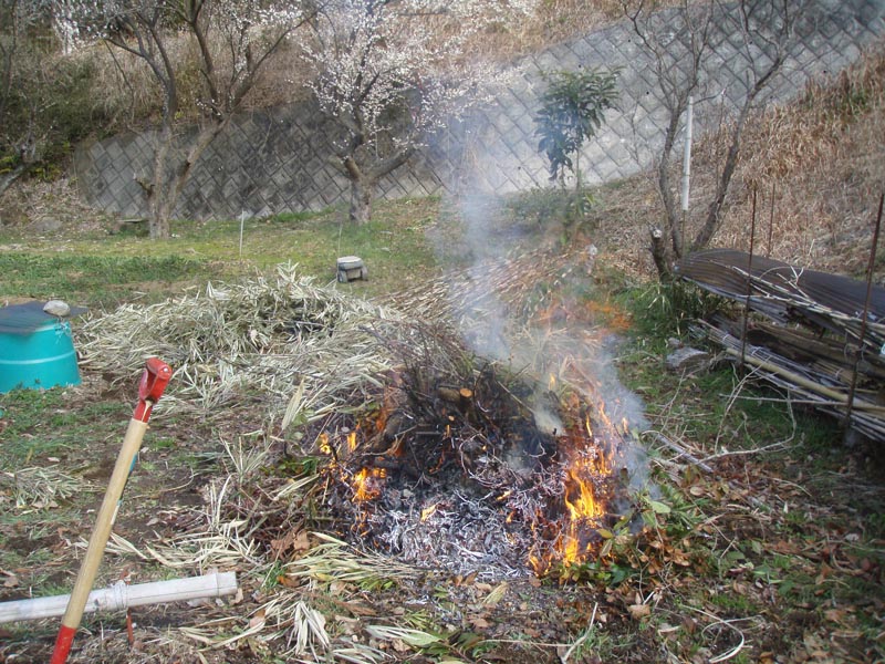 新設 第3菜園の西側に焚き火場を作った、更に西側の栗林まで150~160坪を大家さんから自由に使って良いとの許可が出ている、が周辺は落ち葉や枯れ枝が大量にあり、しかも昨年から不要な松やヒノキ、雑木を切り倒してある、これらの整理の為どうしても焚き火場が必要だった。予報では風の弱い今日がベストと考えて作業に取り掛かったが燃すものが多過ぎ・・・本日予定してた椎茸の原木を採った時の 残り枝まで手が回らず安全確保して着火後1時間半で終了させた。夕方見回りに行ったら煙も見えず大丈夫そうで安心(^o^)/ |