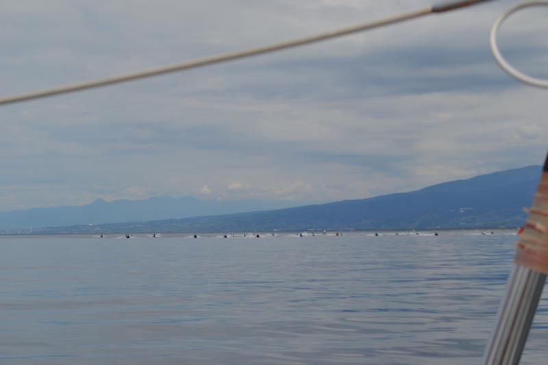 本日は珍しくゲストなし、メインクルーばかりの総員8名(^o^)/朝礼も10秒で終り静浦港で給水後、第六翔航夕丸と打ち合わせた井田を目指して出航・・・風も無く鏡の様に穏やかな海面を見ながら・・・沼津方向から現れた水上バイクの一群、凄いね画面に入り切れない程たくさん・・・夏来るって感じがする。海面は穏やかなのにウネリによる海岸線は引き波が意外に大きく井田の堤防に近づき初めて気が付いた、天気の良さにポーっとして海況の注視を怠っていた。第六翔航夕丸に連絡しながら急遽大瀬の浮桟橋に変更しリターン 陸への橋が外されているので何時もの通り我らの専用桟橋と化し、遮光率50%のオーニングをセット、串焼きをゆっくり楽しむ・・・午後になつて薄っすら顔を見せた富士山、南からの良い風が吹き始め帰路は帆走でのんびり・・・・過し易いお天気で楽しい一日が食べて寝てお喋りして終わった。 |