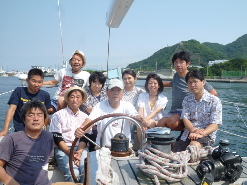春霞の一日 昨日の大雨と台風7号の狭間でNiceDay NiceCruise、千葉から一年振り可愛いShioriちゃんFamilyを迎え総員12名が本日のお仲間、南東からの風が程よく吹き込み静浦港で給水後直ぐにセールアップ、7knot前後で大瀬まで一直線の気持ちの良い帆走をする。井田を目指すも潮の干満と7号のうねりを心配して大瀬に入港、浮桟橋は陸へのブリッジが上っているので我が船の専用桟橋と化し遮光ネットを広々と張り、その中で昼食パーティー・・・暑い陽射しの筈なのに遮光率50%のネット下は風も冷たく寒い位。船長自慢の畑で採れたグリーンピースご飯と串焼きで昼食後はいつもの通り本マグロ・・・・終始にこやかなShioriちゃんがアイドルの一日だった。 |