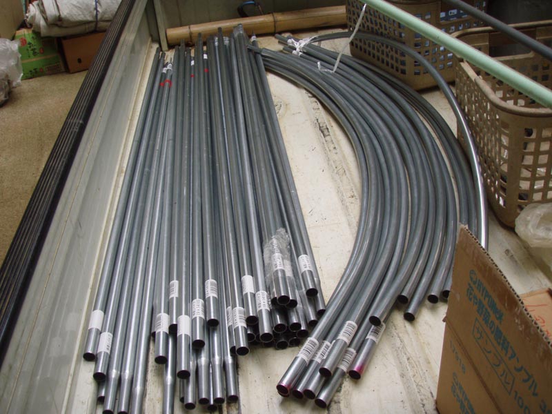 買っちゃった! トマト用の雨除けハウスを・・・・ホームセンターでバラ買いしたら11,000円程度で買えた。夏野菜のシーズンになり毎年頭を悩ますのがトマトの雨対策・・・ナスやキュウリは雨が欲しいがトマトは乾燥が必要で雨に当たると病気になったり実腐りが出たりの難しい野菜。今迄自作で色々試したが強風対策が出来ずに失敗の連続、で お小遣いをはたいて買ってみた次第。ミニトマト用ももう一棟作れば万全(^o^)/ 素材 開始(08:55) 骨組み完了(09:45) 屋根葺き完了(11:10) |