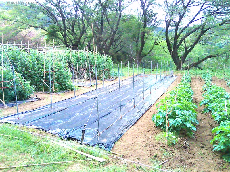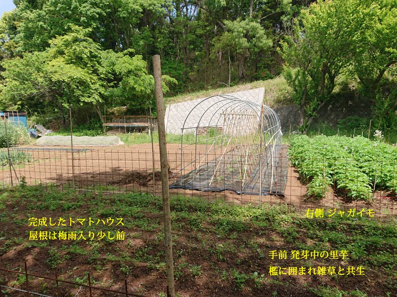 ムカデ・トマトハウス・ジャガイモ畑 4匹目のムカデが翌日(5/19)枕元の数センチに・・・・撮影してから凍結、ハサミでちょん切りトイレで流した。侵入口と思われる所を甥に塞いでもらいこの数日様子見をしている。4/22に開始したトマトハウスが防鳥ネット・屋根を取付て5/23に完成した、中の苗29本はすくすくと成長している。長さ10m幅2mは家庭菜園ではチョット大き過ぎ? 隣のジャガイモ畑もワイヤーメッシュを張り巡らせイノシシ対策も完成。お天気次第だが順調に育って欲しいです。 |