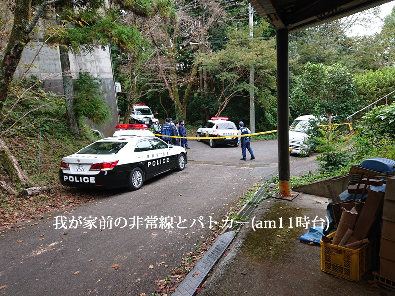 火事だ!向かいの方から電話(18時半頃?)、 1Fから覗くと直ぐ近くからパチパチ音と赤い炎が見える、通報の仕方が判らないとの事で直ぐに119番。2Fのベランダに上がると1軒置いた向こうから激しい炎が・・消防車のサイレンは聞こえるが遅々として到着しない。炎は益々激しくなる、幸い無風で火炎と火の粉は真っ直ぐ上空へ、防火水槽の無い我が地域、タンク車が来なければ消火不可能で火の手は上がる一方。Lineビデオ通話で4人の子供達から避難を指示されるが山の中で少し距離があるので避難を躊躇、結局横浜の娘が三島警察に依頼してパトカーが迎えにきて麓の公民館に避難した。午前0時頃帰宅したが我が家の前は消防車 今日まで非常線が張られて通行止め。いざとなると何を持ちだすのか判らなくてウロウロするばかり日頃の災害準備不足を痛感した次第。大勢の方から心配の電話を戴き感謝! |